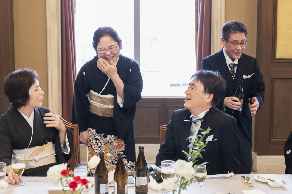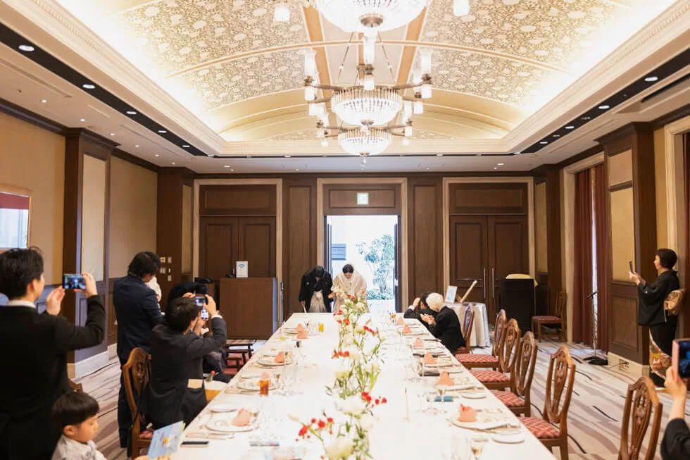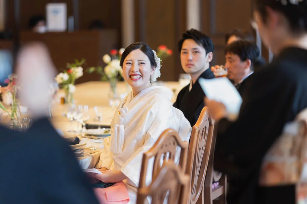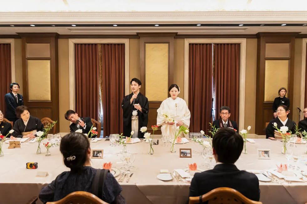 2025.02.02 大切な家族と過ごすかけがえのない一日 挙式会場 : 天星殿 披露宴会場 : クレール スタイル : 神前式 人数 : 14名 親族様のみだからできる、絆が深まる一日 親族様のみの少人数パーティーを選ばれた、おふたりのご結婚式をご紹介します。 披露宴では間延びしないように、そして親族様に楽しんでいただけるような工夫を取り入れられました。 自然光に包まれる神殿での神前式 移動もスムーズなホテル内の神殿で神前式を。 ご家族に見守られながら、厳かに誓いを立てられました。 ご紹介を披露宴で 演出のひとつとして行った親族紹介では、新郎新婦様の紹介を両家お母様より、子供の時のエピソードとともに話していただきました。 新郎様は思わず涙ぐまれ、新婦様は微笑ましい表情で見守られとても心温まる素敵なシーンでした。 写真撮影もただ撮影するだけではなく、演出に。 皆様からそれぞれ新郎新婦様へ、また新郎新婦様からは親族様一人ひとりにメッセージを書き、それをお互い持って撮影しました。 とても和やかなひとときとなり、記憶に残る1日となりました。 レポート一覧を見る トップページに戻る